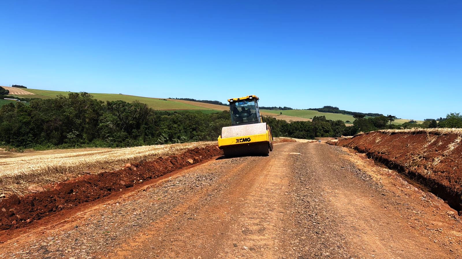 Na estrada da Linha Brinckmann, seguindo pela Arroio Grande até a Linha Vargem Bonita, a primeira frente de trabalho está atuando no local com uso de uma motoniveladora, um rolo compactador e dois caminhões com pedras marroadas, usadas como base para as pavimentações.
