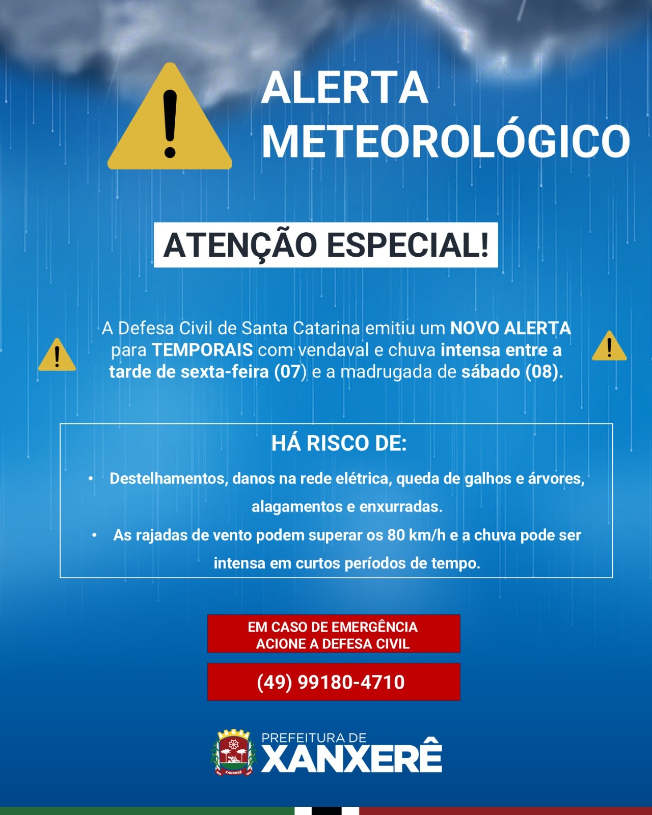A Defesa Civil de Santa Catarina emitiu um NOVO ALERTA para TEMPORAIS com vendaval e chuva intensa entre a tarde de sexta-feira (07) e a madrugada de sábado (08).