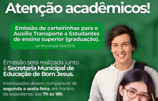 O Bom Jesus, por meio da Secretaria Municipal de Educação, iniciou o cadastro para a emissão da carteirinha do auxílio transporte universitário, benefício concedido conforme a Lei Municipal nº 626/2015. A iniciativa atende estudantes que utilizam o transporte para cursar o ensino superior fora do município.