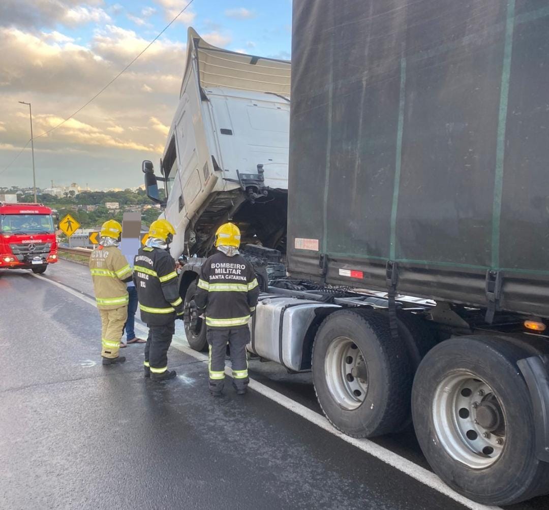 Carreta pega fogo na BR-282 em Xanxerê; motorista controla as chamas antes da chegada dos bombeiros