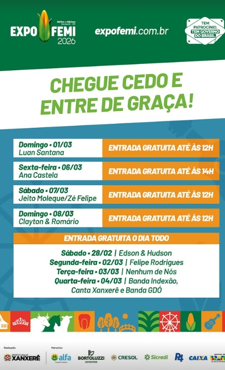 A organização reforça a orientação para que o público chegue cedo para garantir a entrada gratuita e aproveitar toda a estrutura da ExpoFemi, que além dos shows conta com feira comercial, exposições, gastronomia e atrações para toda a família.