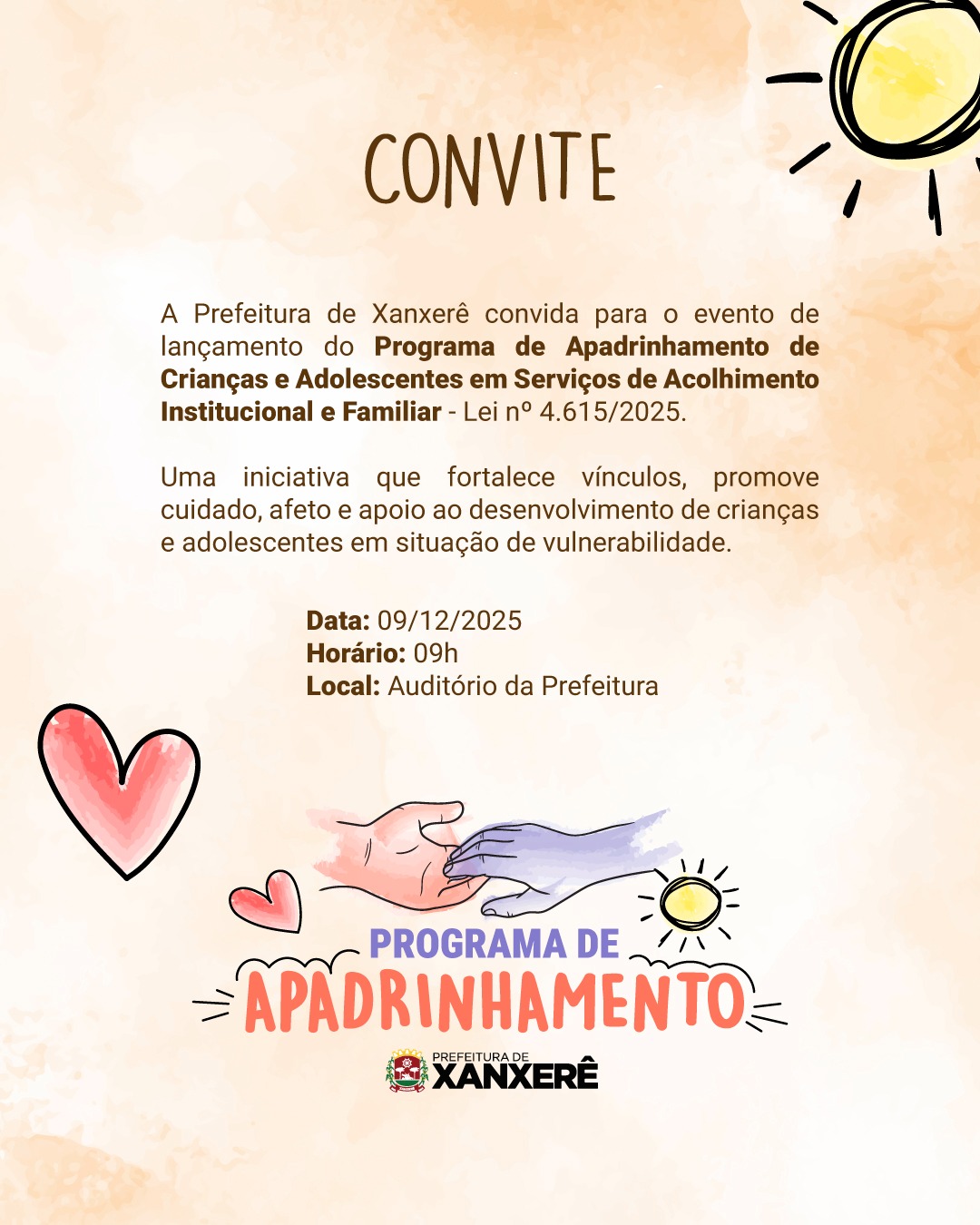 A Prefeitura de Xanxerê convida para o evento de lançamento do Programa de Apadrinhamento de Criancas e Adolescentes em Servicos de Acolhimenta Institucional e Familiar – Lei no 4.615/2025