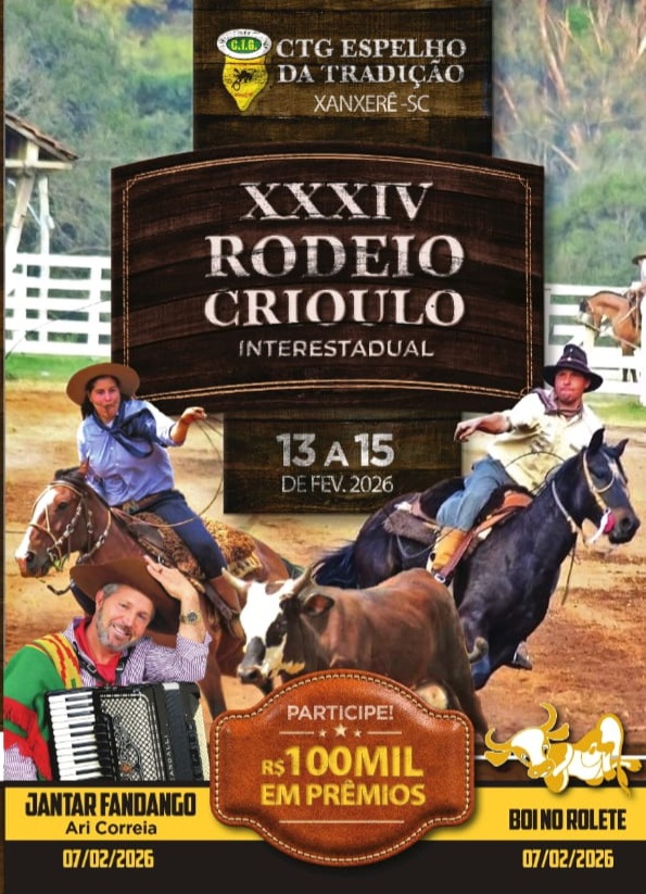 O CTG Espelho da Tradição, de Xanxerê, realizará entre os dias 13 e 15 de fevereiro de 2026 o XXXIV Rodeio Crioulo Interestadual, um dos eventos tradicionalistas mais aguardados da região Oeste de Santa Catarina. O rodeio acontecerá no parque do CTG e deve reunir laçadores, famílias e apreciadores da cultura gaúcha de diversos municípios e estados.