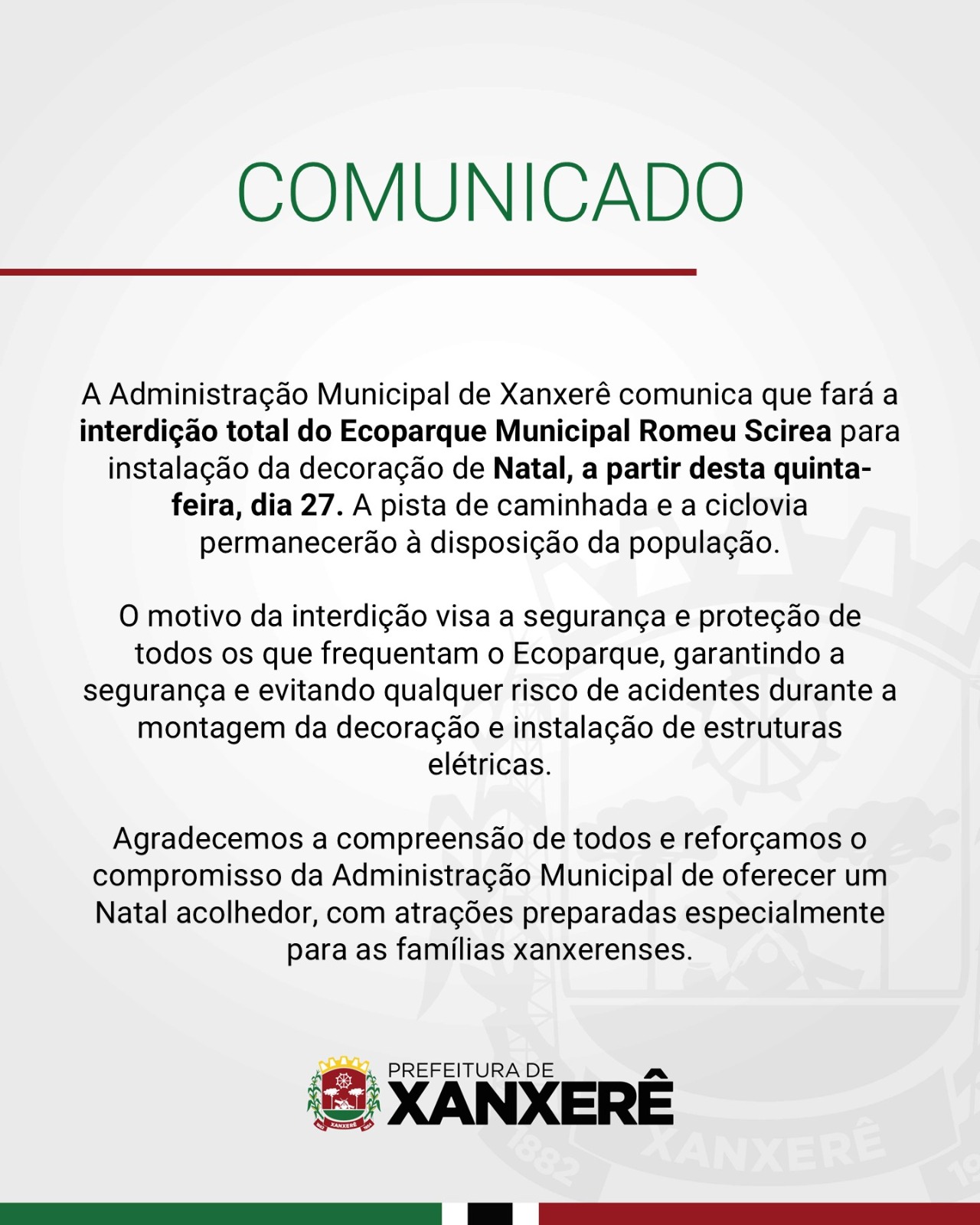 A Administração Municipal de Xanxerê comunica que fará a interdição total do Ecoparque Municipal Romeu Scirea para instalacão da decoracão de Natal, a partir desta quinta- feira, dia 27. A pista de caminhada e a ciclovia permanecerão à disposicão da população ○ motivo da interdição visa a segurança e proteção de todos os que frequentam o Ecoparque, garantindo a segurança e evitando qualquer risco de acidentes durante a montagem da decoracão e instalacão de estruturas elétricas. Agradecemos a compreensão de todos e reforcamos o compromisso da Administração Municipal de oferecer um Natal acolhedor, com atrações preparadas especialmente para as famílias xanxerenses