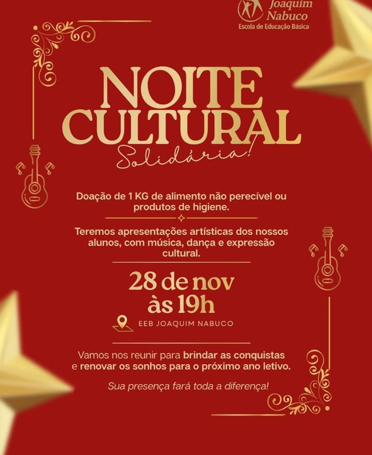 A Escola de Educação Básica Joaquim Nabuco, em Xanxerê, realiza nesta quinta-feira (28), às 19h, a Noite Cultural Solidária, reunindo a comunidade escolar em um encontro de celebração, arte e solidariedade. A entrada será na forma de contribuição com 1 kg de alimento não perecível ou produto de higiene.