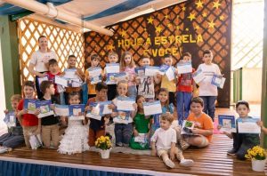 A Escola Luiz Lunardi, na Vila Tigre, em Xaxim (SC), realizou no segundo semestre o Chá Literário 2025, atividade coletiva e interdisciplinar que mobilizou estudantes, professores e famílias. A edição deste ano teve como destaque o projeto Estante Mágica: cada criança do 2º ano escreveu e ilustrou o próprio livro, publicado na plataforma e apresentado em uma sessão de autógrafos durante o evento. Previsto no Projeto Político-Pedagógico (PPP), o Chá Literário estimula competências da BNCC como investigação, reflexão, análise crítica, imaginação e criatividade na resolução de problemas. A partir das leituras em sala, cada turma escolheu um texto — conto, poesia ou outros gêneros — para estudar, interpretar e apresentar em dramatizações, contações, encenações e releituras criativas. As salas foram ambientadas tematicamente, tornando o percurso mais acolhedor e inspirador. No dia do evento, pais e responsáveis circularam em grupos para acompanhar as produções, fortalecendo vínculos entre escola e comunidade. Entre uma apresentação e outra, foram servidos chá e biscoitos, em um momento de integração. No projeto Estante Mágica, os professores do 2º ano utilizaram o laboratório de informática para digitar e diagramar as obras dos estudantes na plataforma. As famílias puderam adquirir os livros físicos e acessar a versão digital. Segundo a equipe pedagógica, o Chá Literário 2025 reafirmou o compromisso da Escola Luiz Lunardi com a formação de leitores e escritores e celebrou o poder transformador da leitura e da escrita na vida das crianças e de toda a comunidade escolar.