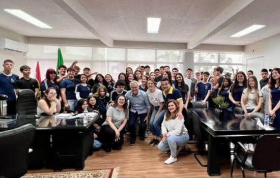 Em seguida, os estudantes foram recebidos no gabinete do prefeito. O encontro permitiu aos jovens conhecer de perto como funciona o Executivo Municipal e conversar diretamente com o chefe do poder público. Ao longo da visita, Oscar Martarello falou sobre obras e ações que estão sendo realizadas no município, explicando as prioridades da administração e respondendo a questionamentos dos alunos.