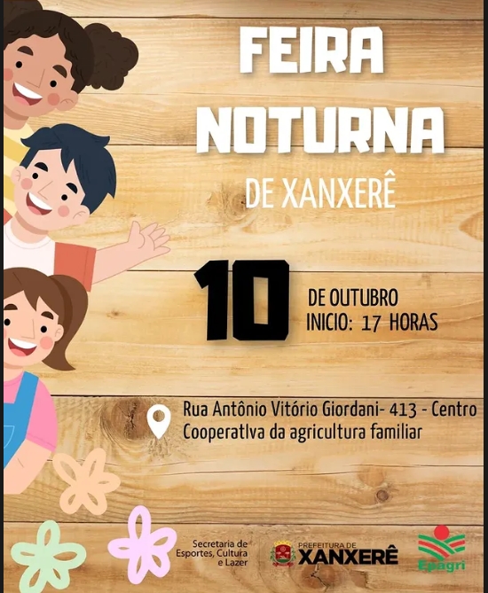 A Feira Noturna de Xanxerê será realizada no dia 10 de outubro, com início às 17 horas, na Rua Antônio Vitório Giordani, 413, no Centro da cidade. Promovida pela Cooperativa da Agricultura Familiar, a feira reunirá produtores locais oferecendo alimentos frescos, artesanatos e produtos típicos da região.