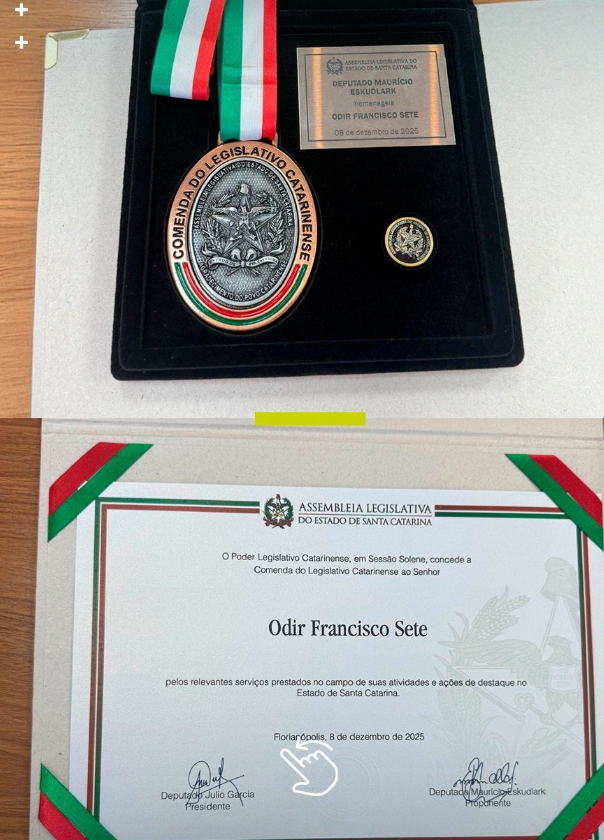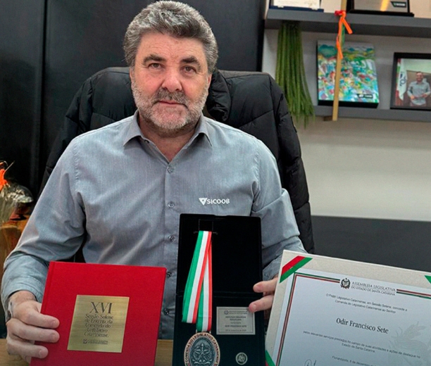 O gerente-geral do Sicoob Credimoc, Odir Francisco Sete, foi um dos 41 homenageados com a Comenda do Legislativo Catarinense 2025, a mais alta distinção concedida pela Assembleia Legislativa de Santa Catarina (ALESC). A sessão solene, que reconhece personalidades e organizações por sua contribuição ao desenvolvimento social, econômico e humano do estado, ocorreu na última terça-feira, dia 08, no Plenário Deputado Osni Régis.