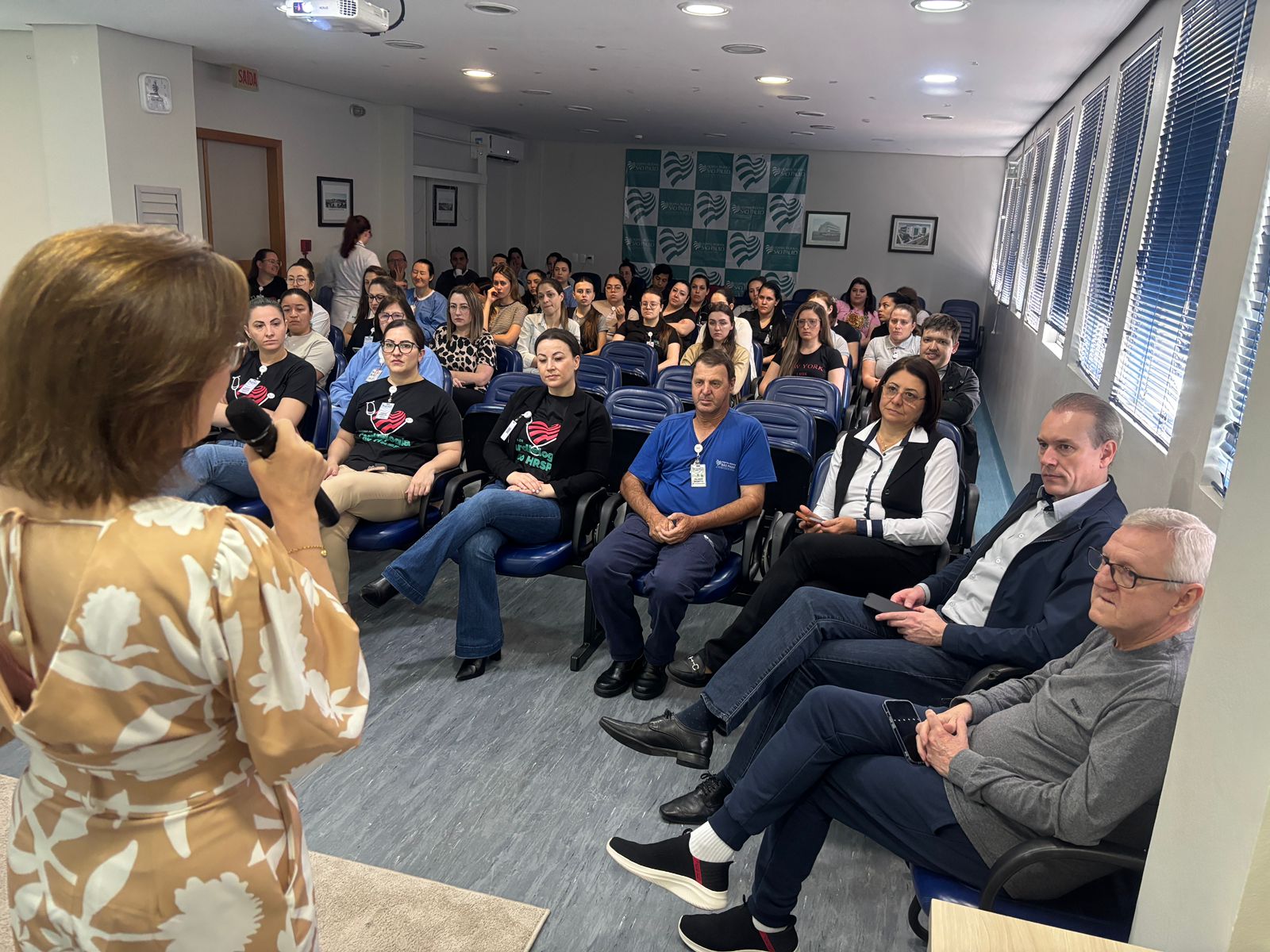 O Hospital Regional São Paulo (HRSP), de Xanxerê, deu início nesta segunda-feira (27) à 14ª Semana da Cardiologia, reunindo colaboradores e profissionais da saúde em uma programação voltada à qualificação técnica e à conscientização sobre os cuidados com o coração. A abertura contou com a palestra da cardiologista Dra. Marinês Peres, intitulada “Admissão de paciente cardiológico: o que precisamos saber?”, que abordou práticas seguras e humanizadas no acolhimento de pacientes cardíacos desde o primeiro atendimento.