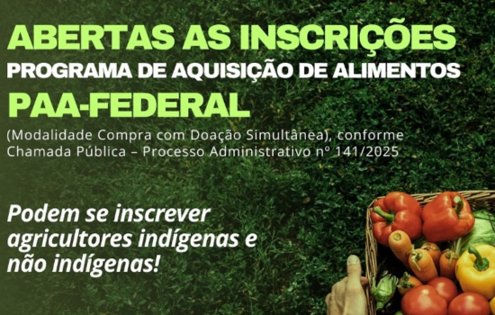 O Governo Municipal de Ipuaçu abriu as inscrições para o Programa de Aquisição de Alimentos (PAA-Federal), na modalidade Compra com Doação Simultânea, conforme a Chamada Pública – Processo Administrativo nº 141/2025. A iniciativa é voltada a agricultores indígenas e não indígenas, com atendimento realizado em horário comercial, no Centro de Múltiplo Uso, entre os dias 21 e 30 de outubro.