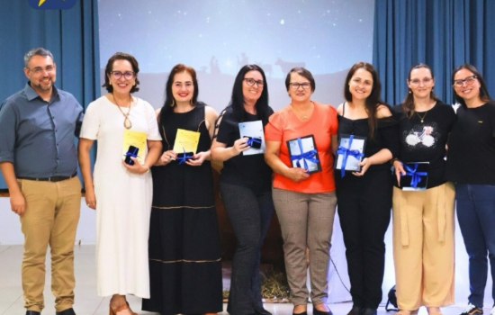 Foram homenageados pelos 15 anos de casa: Clarice Varnier, auxiliar de serviços gerais, e Fabiola Zwicker, coordenadora pedagógica. Pelos 20 anos, recebeu reconhecimento Lucivania Andreia Wolf de Medeiros, assistente administrativo. Com 25 anos, foi homenageada Josiane da Silva Paz, professora.