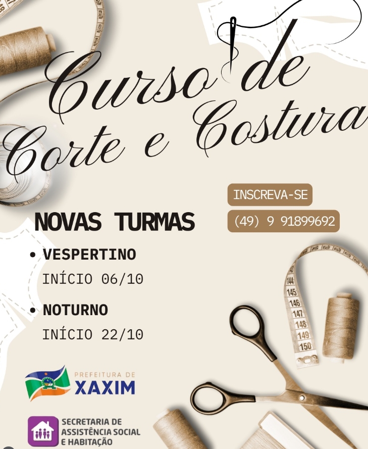 Estão abertas as inscrições para novas turmas do curso gratuito de costura em Xaxim. A iniciativa busca ensinar uma habilidade prática e útil, que pode ser transformada em fonte de renda para os participantes.