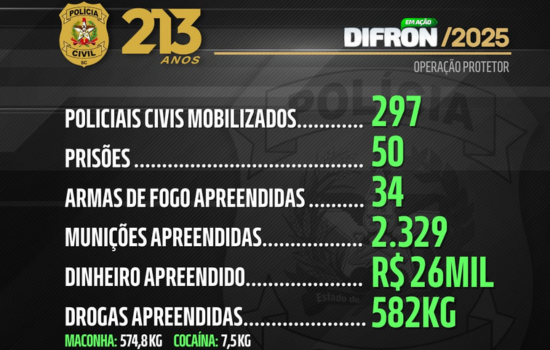 Durante o ano de 2025, a Polícia Civil empregou 297 policiais civis nas operações, efetuou 50 prisões, apreendeu 34 armas de fogo e 2.329 munições. Também foram retirados de circulação 582 quilos de drogas, impactando diretamente as estruturas financeiras das organizações criminosas que atuam na região.
