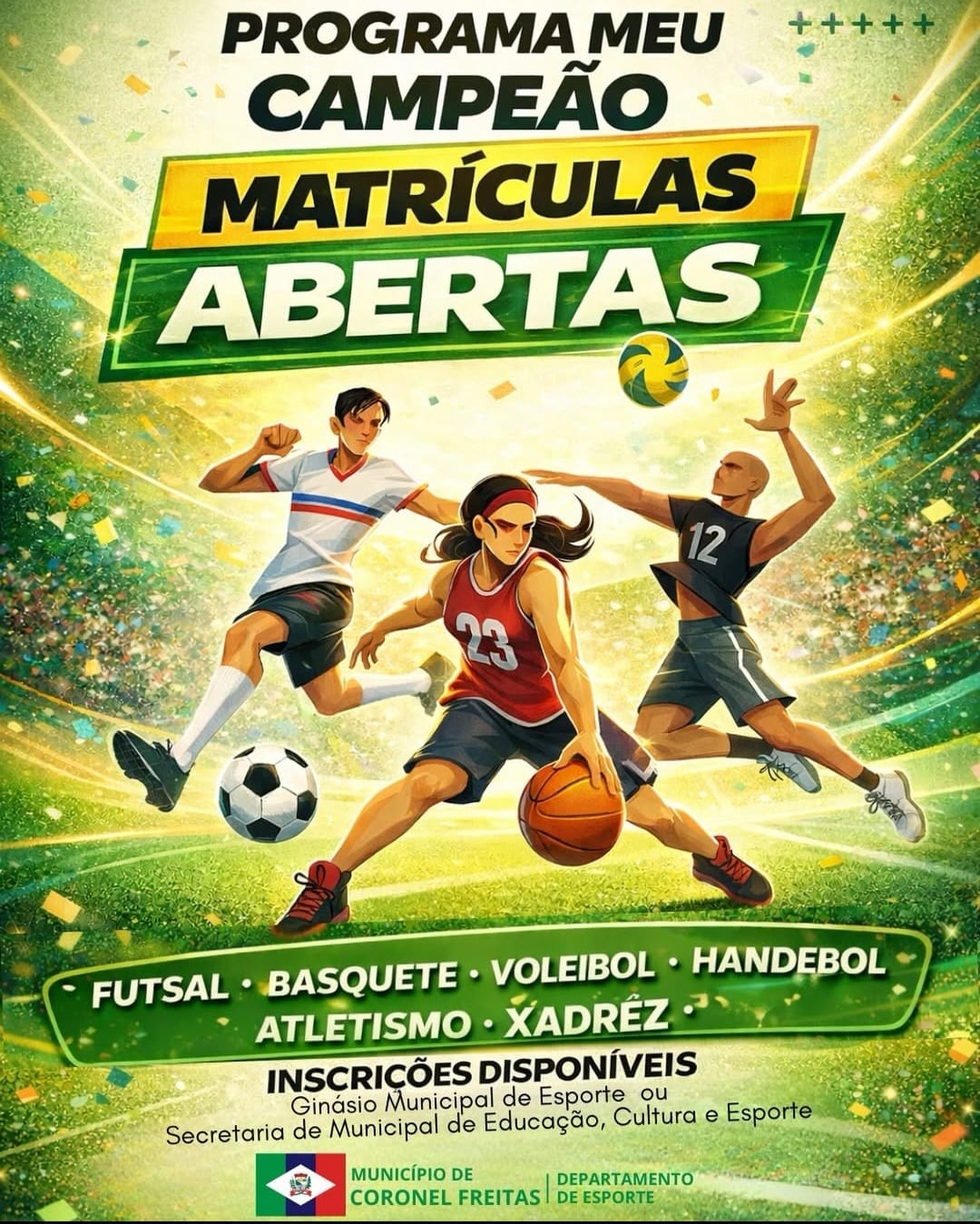 A Prefeitura de Coronel Freitas anunciou a abertura das matrículas para as escolinhas esportivas do Programa Meu Campeão, iniciativa voltada a crianças e adolescentes com foco no incentivo ao esporte, aprendizado e desenvolvimento social.