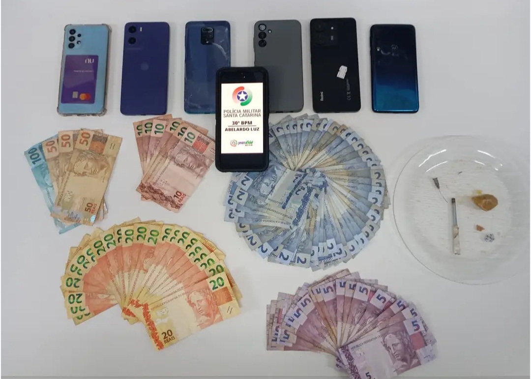 Na sequência, a guarnição se deslocou até a residência do suspeito, onde outro homem, de 27 anos, foi visto arremessando entorpecentes pela janela do imóvel ao perceber a presença policial. Durante as buscas, os policiais apreenderam aproximadamente 9 gramas de crack, cerca de R$ 900 em dinheiro e diversos aparelhos celulares, além de outros materiais relacionados ao tráfico.
