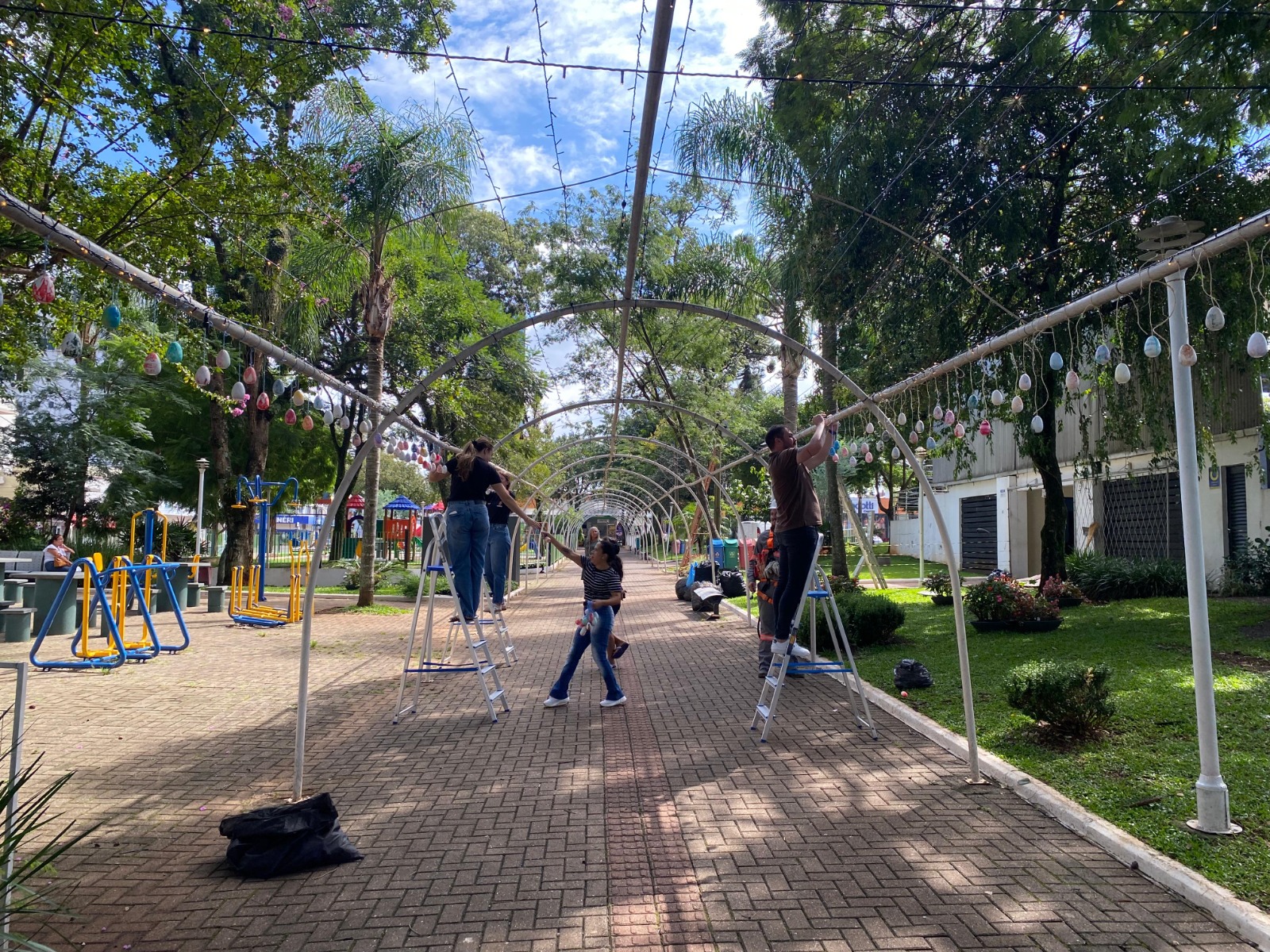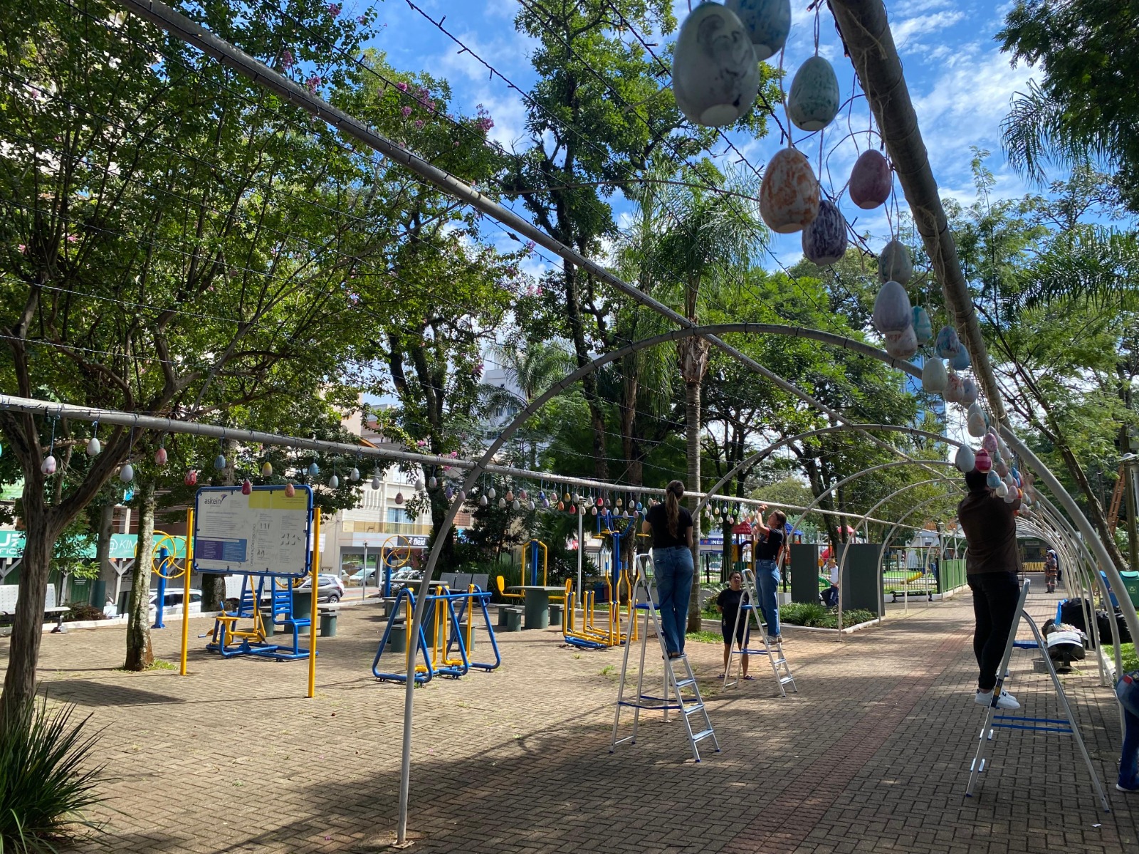 As mais de cinco mil casquinhas de ovo que serão penduradas na praça são resultantes de atividades educativas realizadas em 2025 e em 2026. Os responsáveis por pintá-las foram os alunos da Rede Municipal de Ensino de Xanxerê, da APAE e da Secretaria de Assistência Social.