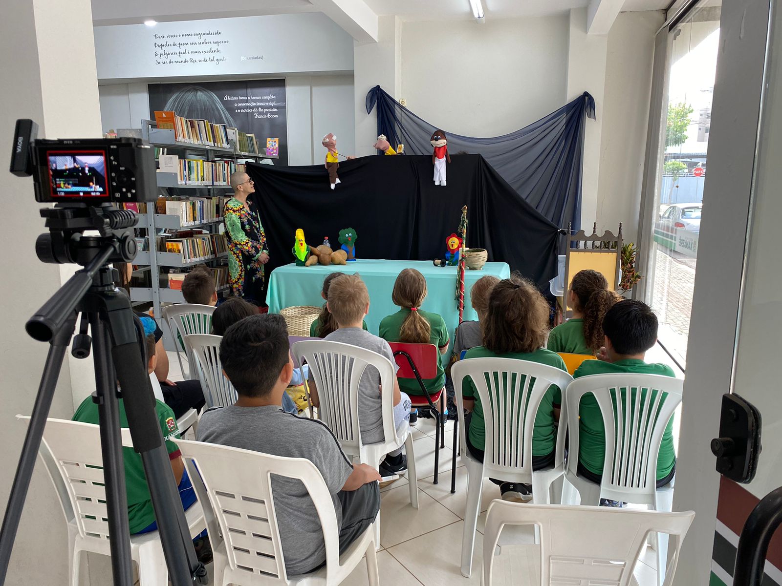 15h: Contação de histórias com mediadores do curso de Pedagogia da Unoesc Xanxerê, sob a supervisão da professora de Licenciatura Infantil, Rossaly Beatriz Chioquetta Loresent – Alunos da EEB Romildo Czepanhik.