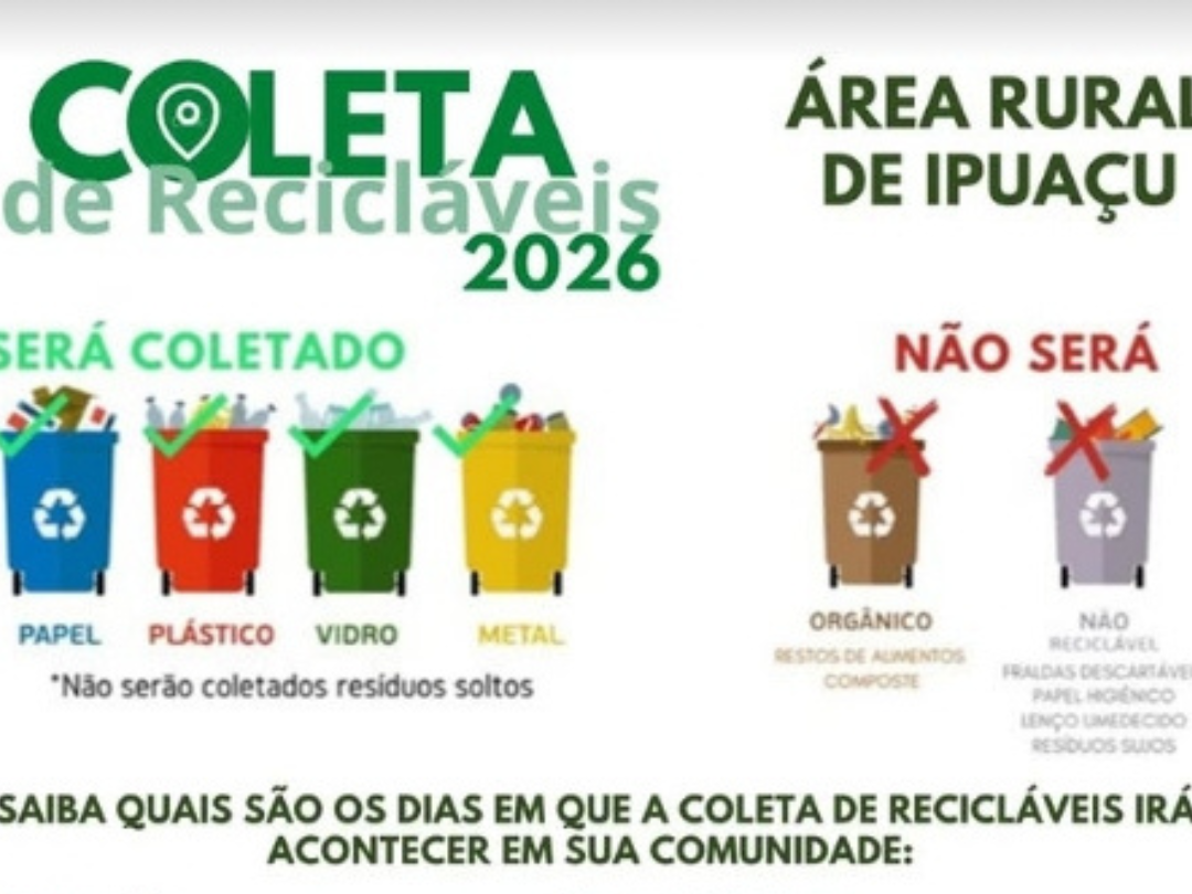 A Prefeitura de Ipuaçu divulgou o calendário oficial de coleta de recicláveis para a área rural em 2026, com datas definidas para cada comunidade do município. A iniciativa tem como objetivo organizar o recolhimento dos resíduos, incentivar a destinação correta do lixo e fortalecer as ações de preservação ambiental.