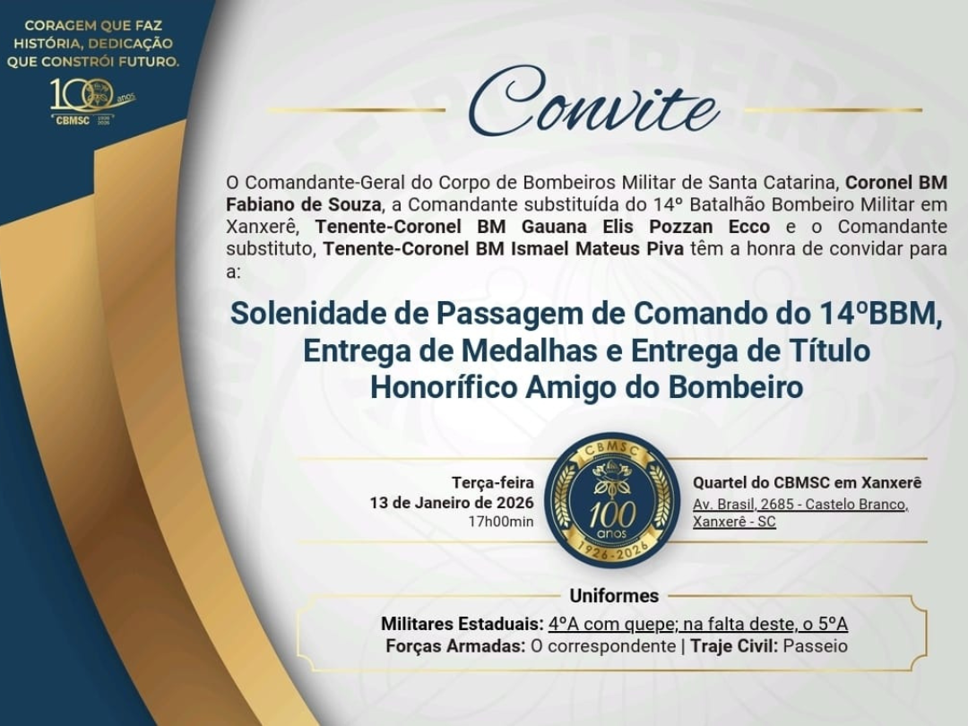 O Corpo de Bombeiros Militar de Santa Catarina (CBMSC) realiza, na próxima terça-feira, 13 de janeiro de 2026, a Solenidade de Passagem de Comando do 14º Batalhão de Bombeiros Militar (14º BBM), em Xanxerê. O evento também será marcado pela entrega de medalhas e pela concessão do Título Honorífico Amigo do Bombeiro, em reconhecimento a personalidades e instituições que contribuem com a corporação.