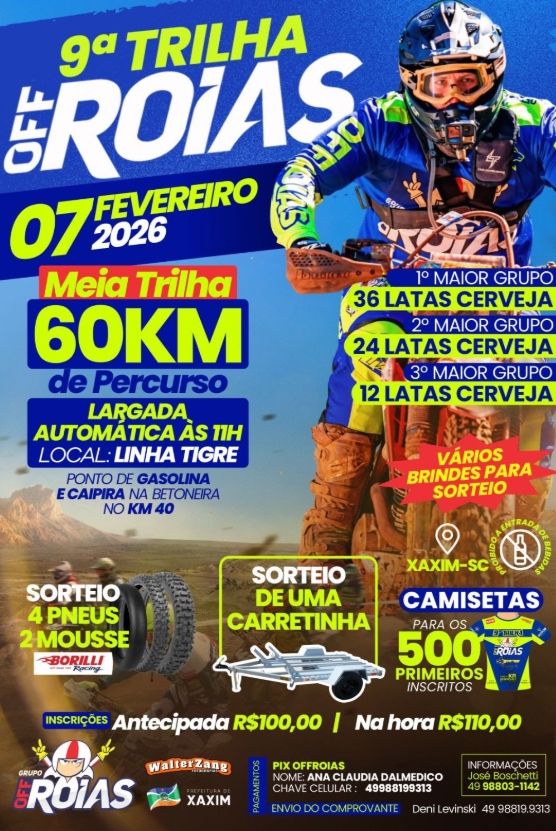 A Trilha do grupo OFFRoías será realizada no dia 7 de fevereiro, em Xaxim, no Oeste de Santa Catarina, reunindo amantes do motociclismo off-road em um percurso de aproximadamente 60 quilômetros pelo interior do município. A largada acontece a partir das 11h, na comunidade da Linha Tigre.