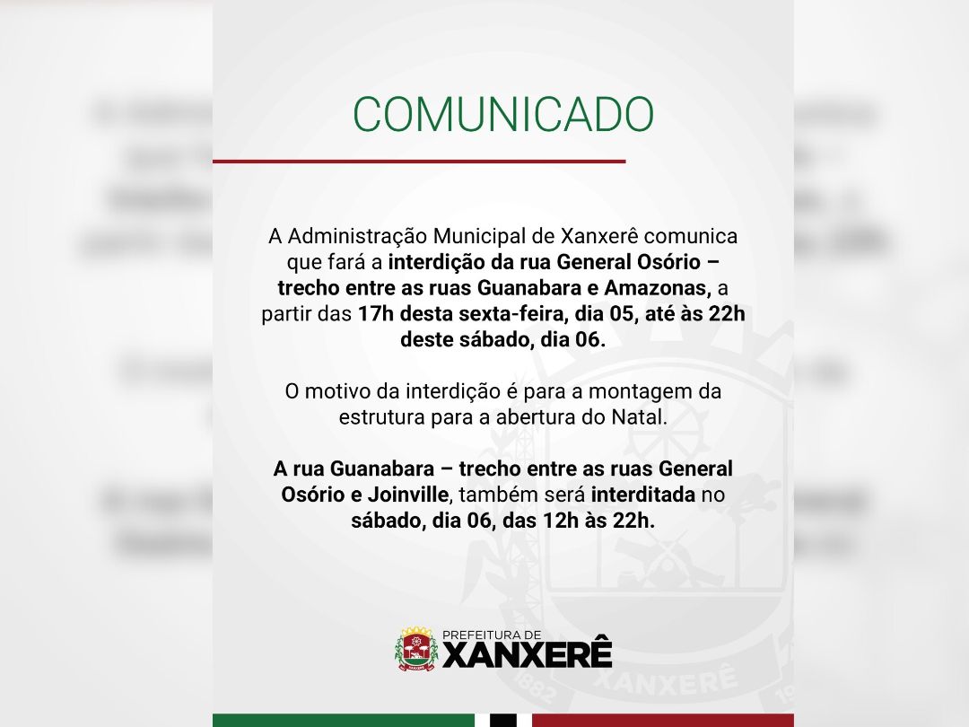 A Administração Municipal de Xanxerê comunica que fará a interdição da rua General Osório – trecho entre as ruas Guanabara e Amazonas, a partir das 17h desta sexta-feira, dia 05, até às 22h deste sábado, dia 06.
