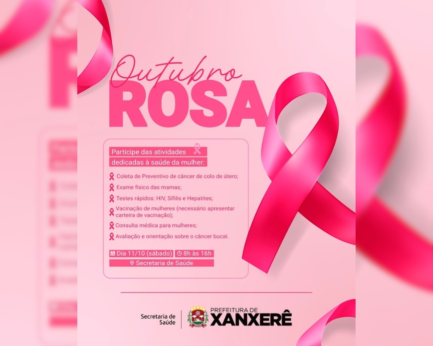 Como parte da campanha Outubro Rosa, a Prefeitura de Xanxerê, por meio da Secretaria de Saúde, realiza neste sábado (11/10) um dia especial de atendimentos gratuitos voltados à saúde da mulher, das 8h às 16h, na própria Secretaria. A iniciativa tem foco na prevenção de doenças como o câncer de colo de útero, câncer de mama e câncer bucal, além da realização de testes rápidos e atualização da vacinação.