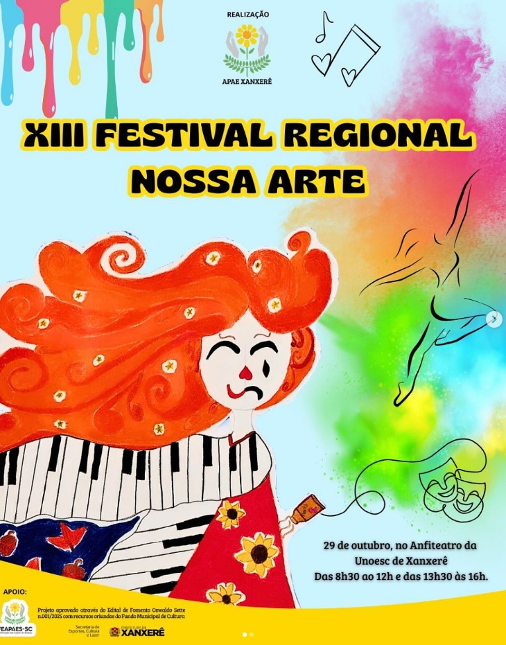 Xanxerê será o palco do XIII Festival Regional Nossa Arte, no dia 29 de outubro de 2025 (quarta-feira), reunindo artistas das APAEs da região Oeste em um grande encontro de arte, talento e inclusão. O evento valoriza a expressão e o protagonismo das pessoas com deficiência, celebrando a criatividade em diferentes linguagens artísticas.